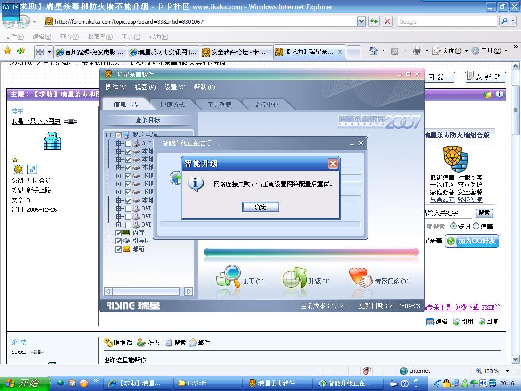 我是正版瑞星2006的用户,以前一直正常,自从操作系统升级为win2003sp2后,瑞星就不能升级,以前win2003sp1下一直正常,瑞星升级程序提示网络连接失败,请正确设置网络后重试,我用的是ie设置的网络连接,查看升级日志提示: