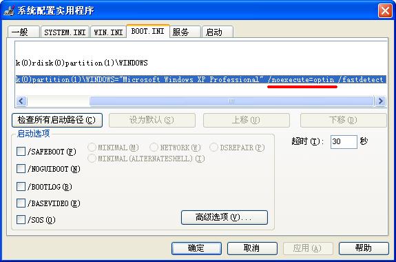 大家也不妨看看自己的BOOT.INI文件,在系统配置实用程序的“BOOT.INI”选项卡下就可以看了(问:什么是系统配置实用程序?怎样打开?答:我晕)!XP单系统的朋友,BOOT.INI文件内容除了“timeout=30”、参数“/fastdetect”这两个项目和我不一样外,其他的应该都差不多。“noexecute=optin”还不清楚,有待高人讲解。