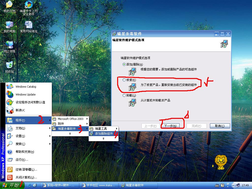 请说说卡卡助手不响应是什么意思,是出现错误提示,还是无法清理也无法关闭?如果是前者,发错误提示的图;如果是后者,修复一下瑞星试试: