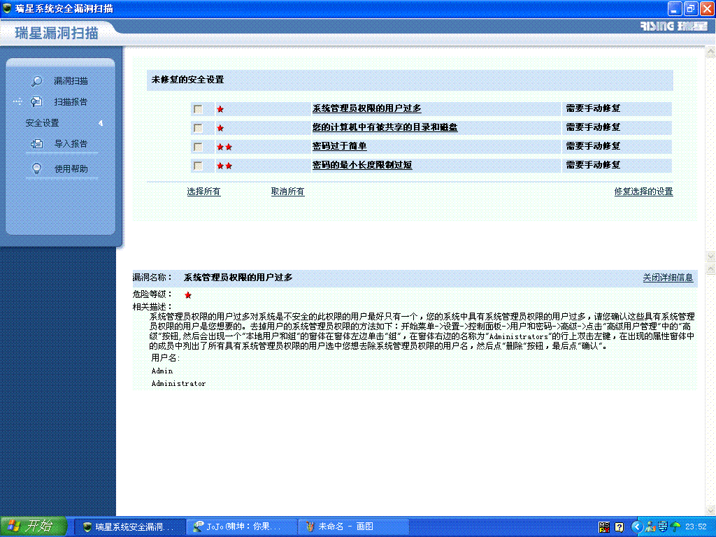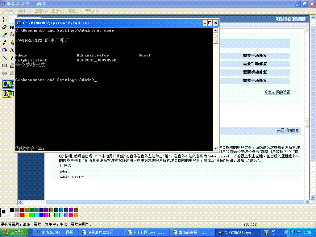 1.瑞星防火墙提示说管理账户太多,我查了一下,确实有5个,不知道是不是病毒。但是按照瑞星的提示根本找不到那个什么“高级..”之类的东西,没办法操作。而且从控制面板进到用户帐户之后,只显示了admin和guest两个账号,其他的都不见了,更无从删起。