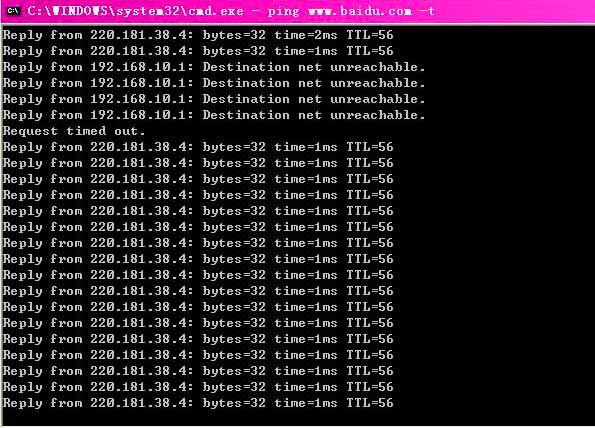 最近局域网经常掉线,有时候在PING外网时,为什么会自动变成网关的地址,但PING到网关却是一切正常,是不是路由器有问题还是局域网内有病毒。比如在PING百度的时候,就会变成图下这样: