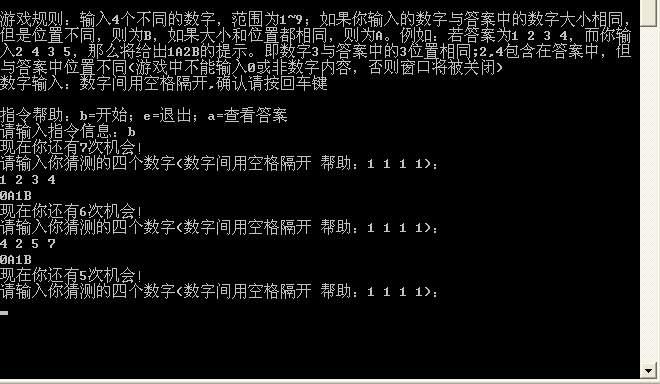 cout<<"游戏规则:输入4个不同的数字,范围为1~9;如果你输入的数字与答案中的数字大小相同,但是位置不同,则为B,如果大小和位置都相同,则为A。例如:若答案为1 2 3 4,而你输入2 4 3 5,那么将给出1A2B的提示。即数字3与答案中的3位置相同;2,4包含在答案中,但与答案中位置不同(游戏中不能输入0或非数字内容,否则窗口将被关闭)"<<endl;