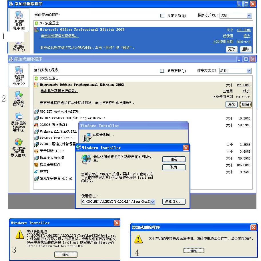 2、想卸载Office2003,重装Office2000,又发现不能卸载,具体看下图。请教高手,多多指教!不胜感激!