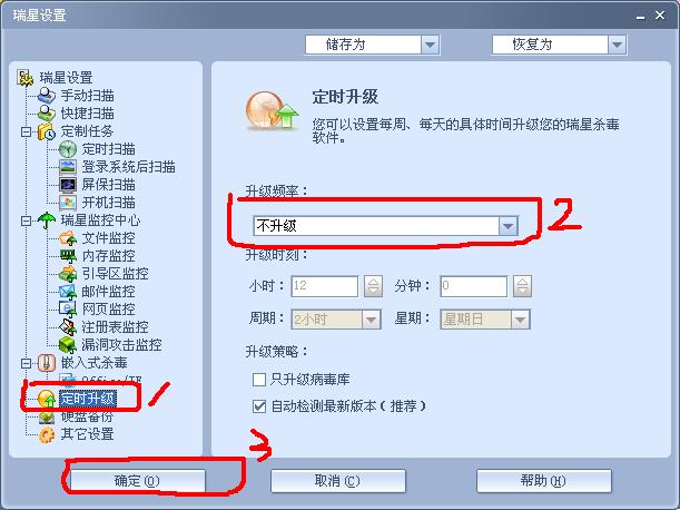 双击瑞星杀软图标,设置--详细设置,按照下图步骤重新设置(如果是定时扫描的,请把1处的项目换成定时扫描)!