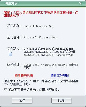 最近总是自动弹出 www.600888.cc/index_10.shtml 这个网站,并且index_后面的数字还会变(如www.600888.cc/index_6.shtml等),接着瑞星显示如图所示,无论点允许还是拒绝都没用。