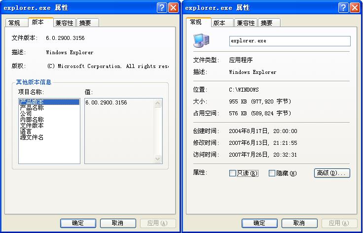 更新了EXPLORER.EXE文件,原文件版本6.0 2900 2180,更新后为6.0 2900 3156 文件修改时间为2007年6月13日