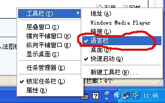 右下角任务栏中的输入法图标消失,在任务栏单击鼠标右键,弹出快捷菜单,把鼠标移动到“工具栏”上,没有“语言栏”选项。