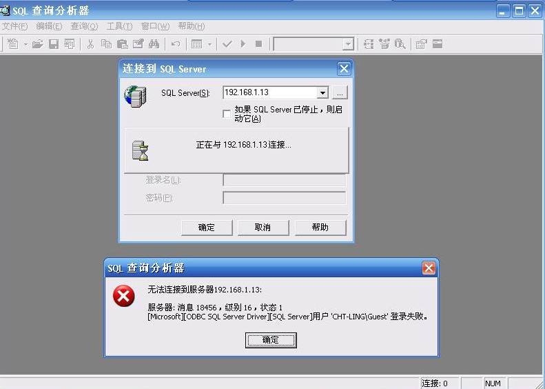 现在客户端无论怎样都连接不了A机的SQL,我以为要开启A机的GUEST帐户,但是开启后都是不能连接,两个SQL都没有设置密码,直接"WINDOWS身份验证".  ............192.168.1.13是A机IP,192.168.1.14是B机IP