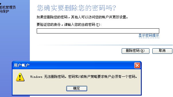 我的电脑设了密码要删除时,说"密码和/或帐户策略要求帐户必须有一个密码!!1,怎么才能删除密码呢???谢谢.说详细点!!!!