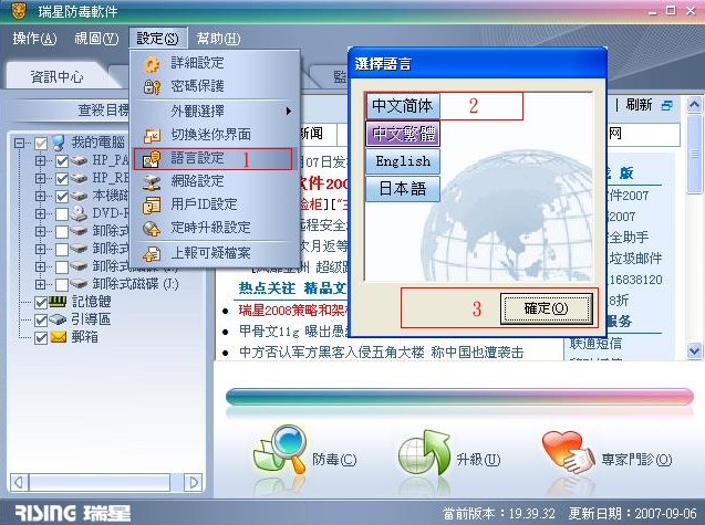 我的杀毒软件变成英语的了,启动的时候出现的那个开机扫描是英语的,右键单击小狮子后也变成英语的了.谁能告诉我怎么弄回中文的吗?谢谢~