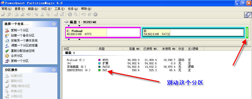 接下来,用PQ加一个分区D(图2)。操作时,注意不要动本本原来的那个SREVICEV001分区。
