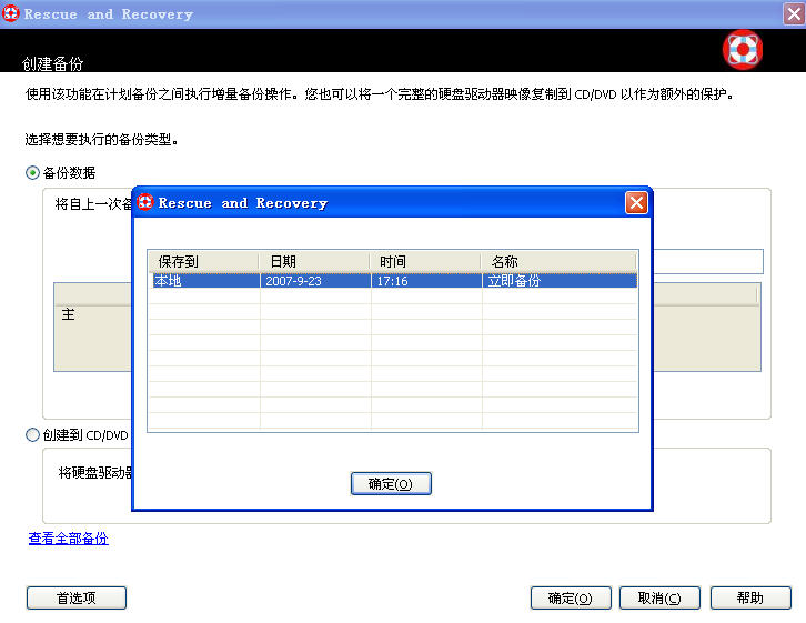 增加D分区后,试试Rescue and Recovery的备份与恢复,没任何问题(图3-6)。