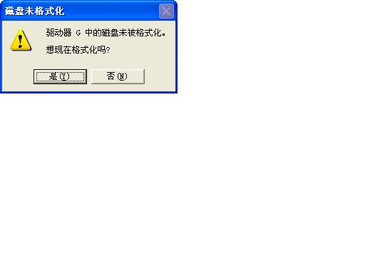 我的U盘装有不少资料,还有旅游拍的照片。现在打开U盘时提示:“驱动器G中的磁盘未被格式化,想现在格式化吗?是 否”
