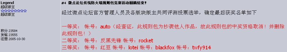 瑞星卡卡安全论坛技术交流区系统软件 【新闻】微 点官方已取消auto规则包竞赛一等奖资格