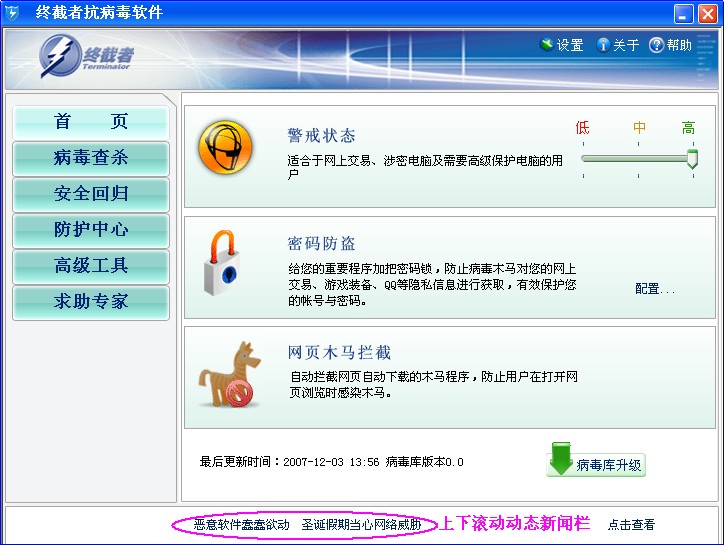 据了解终截者抗病毒软件V6.0除了在原5.30的基础上增强了网页防挂马、改善了安全分析专家扫描功能的易有性及输出报告的易读性外,还新增了流行病毒的查杀功能,这更能保障用户系统不小心被感染流氓病毒后能用终截者快速地自动清除,减少不必要的损失。除了以上功能有所完善和改进外,6.0的界面也得到了进一步的改观,6.0的界面除了考虑用户操作的易用性外,还考虑了整体的视觉效果与5.30时相比,简直是一大飞跃。在6.0的界面上还增加了上下流动新闻栏,可让用户了解更多的安全知识及最新病毒动态新闻。