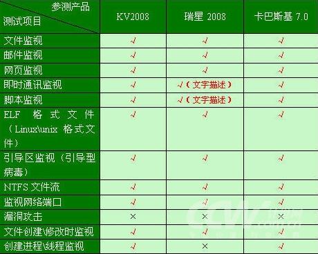 本项测试主要检测杀毒软件在病毒实时监控方面的全面性。除了传统的文件监视、邮件监视、网页监视、即时通讯、脚本监视外,还检测了LINUX格式文件监视、引导区监视、NTFS文件流监视、网络端口数据流监视、文件创建\修改时监视、创建进程\线程时监视。经过测试,除了瑞星2008不支持创建进程\线程监视外,三大杀毒软件基本符合全部支持上述实时监视功能。通过检测也可以看出,三大杀毒软件在技术上确实在不断进步,并在实时监视,尤其是病毒主动防御方面均有了很大的进展