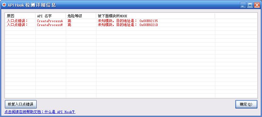 入口点错误:CreateProcessA (危险等级: 高, 被下面模块所HOOK: 0x00E82135)