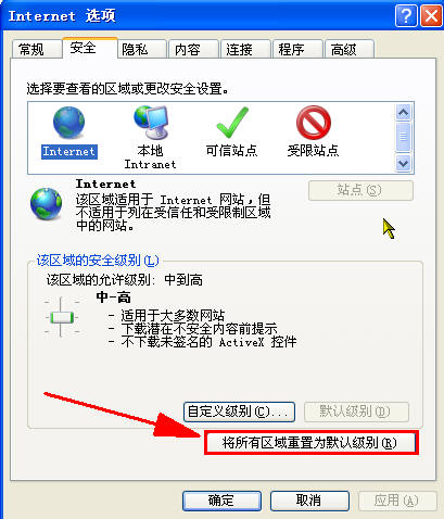 选择“安全”卡项→击下“将所有区域重置为默认级别”项目即可。