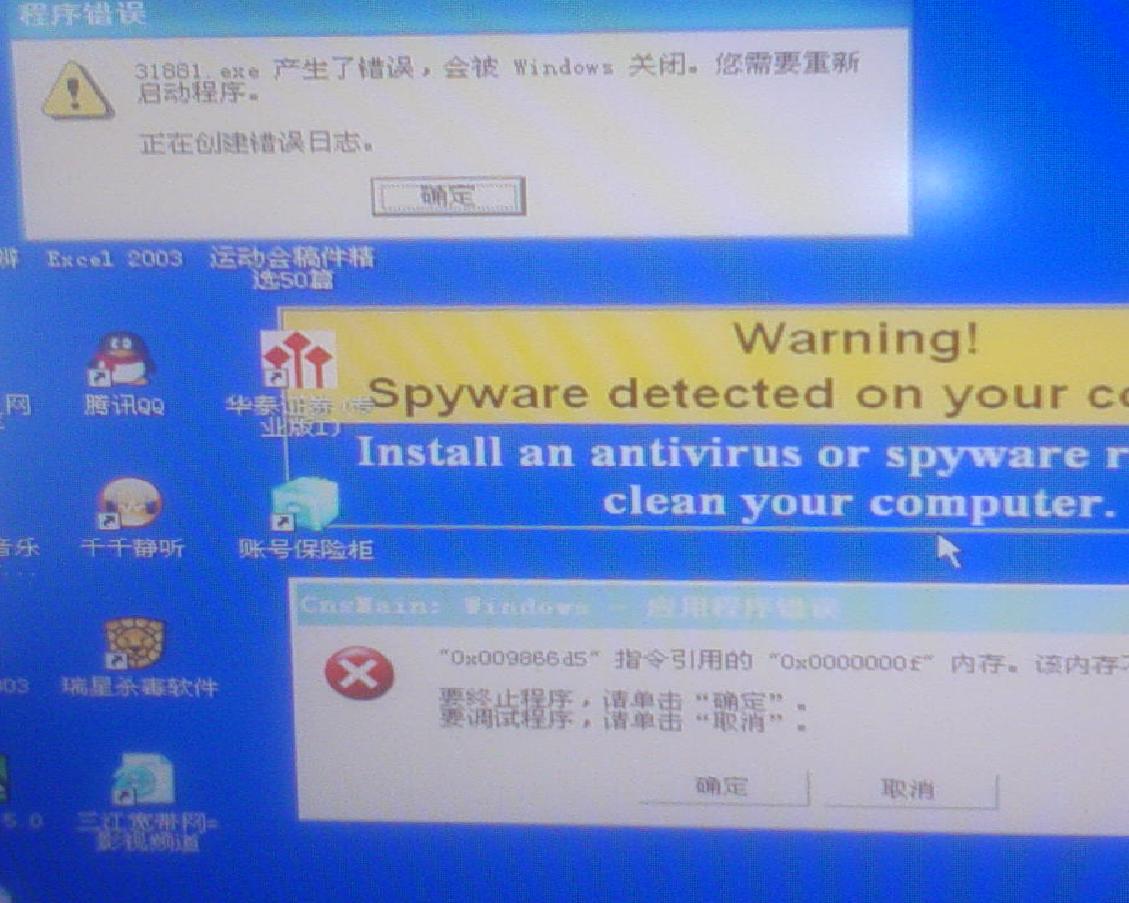 朋友的电脑中了成了这个样子,点哪儿都动不了,瑞星根本启动不了,只是不停的弹出“程序错误”的对话框,在安全模式下也启动不了瑞星,除了重装系统还能怎么办阿?