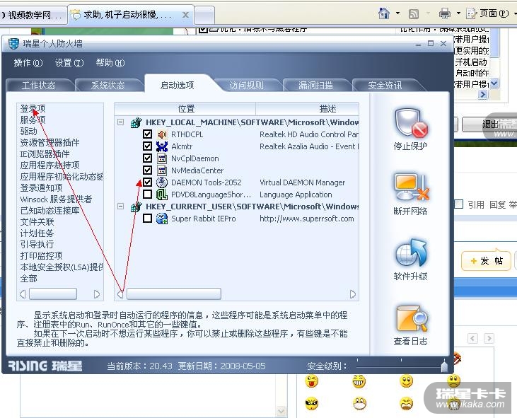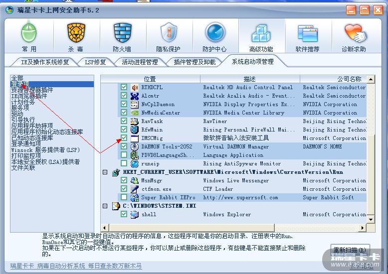 取消没用的随系统加载程序可以加快系统登陆,如果你用瑞星的话可以在瑞星防火墙中或瑞星卡卡助手里接解决,如图。