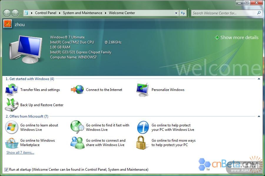 启动后的第一次设置和 Vista 相同,包括帐户名,机器名,时区,桌面背景等。在启动界面的下方,写着大大的 “Windows 7 Ultimate”