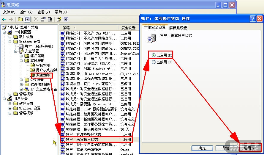 而且 安全选项 帐户:来宾帐户状态 禁用 和启用都是灰的