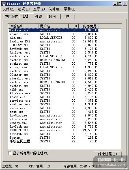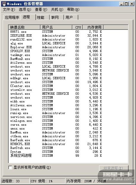 这是我刚开机时的进程,除了瑞星、卡卡、宽带连接外什么程序也没启动。