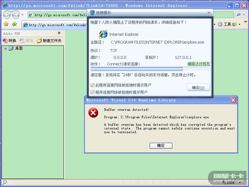 我的IE不能用很久了,记得是在用ADOBE PDF转换时出错后不能用,出错图片如下: