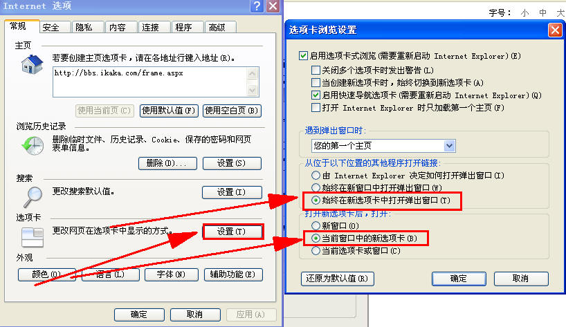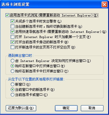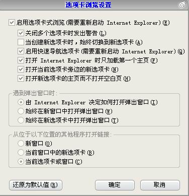 浏览器中的选项卡怎么设置啊,人家都能在同一窗口打开好多网页,然后点选项卡上的标签就可以来回切换了,而我的IE7只能打开一个网页,再打开一个网页就出现在第二个窗口中。下面是我的选项卡的设置,麻烦各位给我看看,请多指教