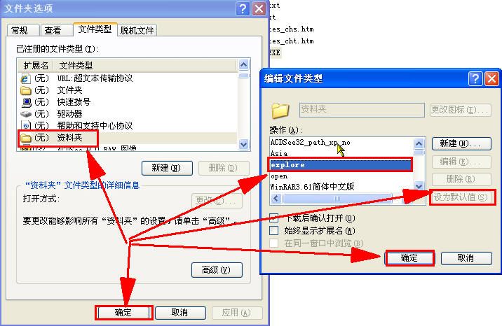 原帖由 水牟寒 于 2008-10-23 21:31:00 发表 我装了一个番茄花园美化版的系统,可是打开我的电脑和任何文件夹都是这样的:如图:但是通过资源管理器打开我的电脑就是正常的XP界面,如图 有正常的文件--编辑---查看--什么的, 但是如果不通过资源管理器打开的话就是什么都没有,连后退向上都找不找!请问大家这到底怎么回事?怎 ①试试在资源管理器里打开文件夹选项方法参见下图红色箭头的指向或者 ②将下面的红色字符代码复制到记事本中再保存后缀名为“inf”的文件名,比如保存为“设置.inf”(不包括引号文件名可随意取)再找到它击右键在选择菜单上选择“安装”即可(正确的保存时的方法是将那些红色代码复制到记事本中:然后先点击→记事本里“保存→保存类型”→的下拉菜单,然后选择→“所有文件”,→在文件名处输入比如“设置.inf”→在“保存类型”下面那项→“编码(E)”的下拉菜单里一定要选择“ANSI”项,然后再点击→“保存”就OK了)。 [version] Signature=$CHICAGO$ [defaultinstall] addreg=My.add.reg [My.add.reg]HKCR,"Folder",,,"资料夹" HKCR,"Folder","EditFlags",0x10001,d2,03,00,00 HKCR,"Folder","TileInfo",,"prop:Size" HKCR,"Folder","BrowserFlags",0x10001,08,00,00,00HKCR,"Folder\DefaultIcon",,0x20000,"%%SystemRoot%%\System32\shell32.dll,3"HKCR,"Folder\shell",,,"explore"HKCR,"Folder\shell\explore","BrowserFlags",0x10001,22,00,00,00 HKCR,"Folder\shell\explore","ExplorerFlags",0x10001,21,00,00,00HKCR,"Folder\shell\explore\command",,0x20000,"%%SystemRoot%%\Explorer.exe /e,/idlist,%%I,%%L"HKCR,"Folder\shell\explore\ddeexec",,,"[ExploreFolder(""%%l"", %%I, %%S)]" HKCR,"Folder\shell\explore\ddeexec","NoActivateHandler",,""HKCR,"Folder\shell\explore\ddeexec\application",,,"Folders"HKCR,"Folder\shell\explore\ddeexec\ifexec",,,"[]"HKCR,"Folder\shell\explore\ddeexec\topic",,,"AppProperties"HKCR,"Folder\shell\open","BrowserFlags",0x10001,10,00,00,00 HKCR,"Folder\shell\open","ExplorerFlags",0x10001,12,00,00,00 HKCR,"Folder\shell\open","openrFlags",0x10001,21,00,00,00HKCR,"Folder\shell\open\command",,0x20000,"%%SystemRoot%%\Explorer.exe /idlist,%%I,%%L"HKCR,"Folder\shell\open\ddeexec",,,"[ViewFolder(""%%l"", %%I, %%S)]" HKCR,"Folder\shell\open\ddeexec","NoActivateHandler",,""HKCR,"Folder\shell\open\ddeexec\application",,,"Folders"HKCR,"Folder\shell\open\ddeexec\ifexec",,,"[]"HKCR,"Folder\shell\open\ddeexec\topic",,,"AppProperties"HKCR,"Folder\shellex\ColumnHandlers\{0D2E74C4-3C34-11d2-A27E-00C04FC30871}",,,""HKCR,"Folder\shellex\ColumnHandlers\{24F14F01-7B1C-11d1-838f-0000F80461CF}",,,""HKCR,"Folder\shellex\ColumnHandlers\{24F14F02-7B1C-11d1-838f-0000F80461CF}",,,""HKCR,"Folder\shellex\ColumnHandlers\{66742402-F9B9-11D1-A202-0000F81FEDEE}",,,""HKCR,"Folder\shellex\ContextMenuHandlers\ContentMenuFloadEx",,,"{6AD0DBCE-35C3-4DA2-A8A4-114A2D8C6158}"HKCR,"Folder\shellex\DragDropHandlers\{BD472F60-27FA-11cf-B8B4-444553540000}",,,""