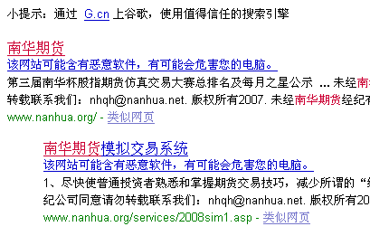 我想学习操作期货,在百度知道中知道南华期货有模拟软件提供,就搜索了一下,但看提示有可疑软件,不敢进去。不知是否真的有问题?有某些论坛提供的据说是免费的模拟软件,不知会不会有安全问题?谢谢!
