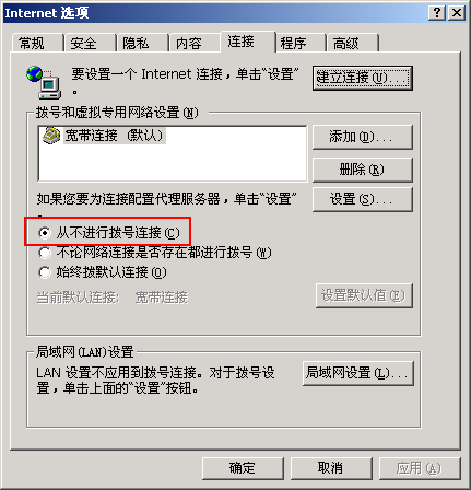 打开ie浏览器点击工具——internet选项,点击连接标签,选择从不进行拨号连接即可。