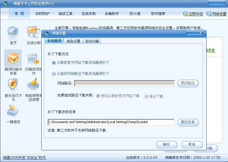 卡卡下载的补丁程序默认路径为:C:\Documents and Settings\Administrator\Local Settings\Temp\Scanbd,将此文件夹内文件删除即可。