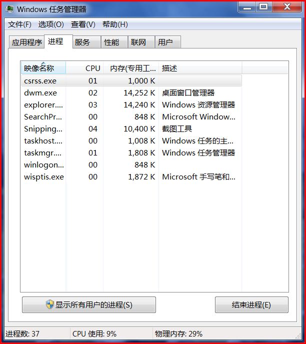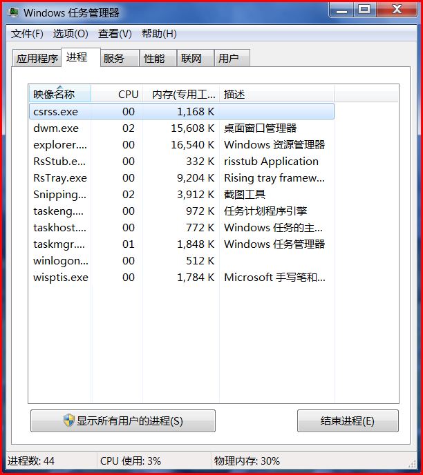 先看下未安装RIS时,windows 7 上任务管理器上有关信息。