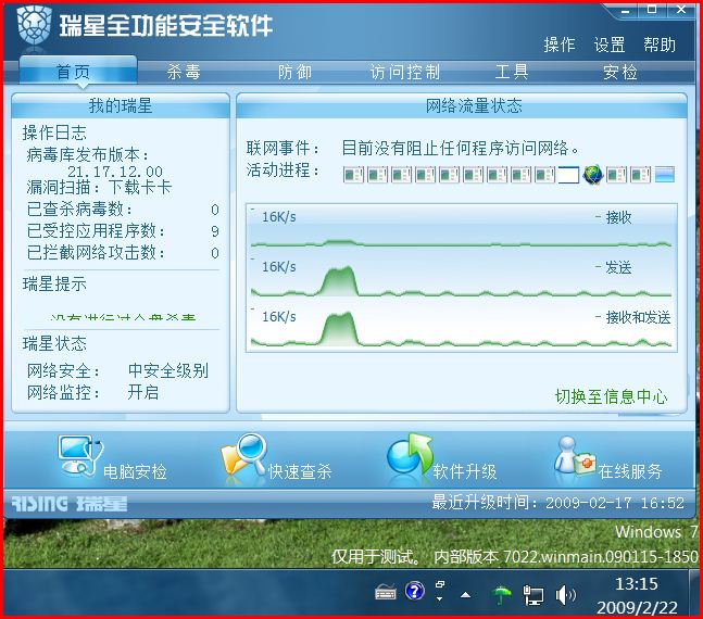 windows 7 还没安装杀毒软件,今天就用瑞星全功能软件试试吧。
