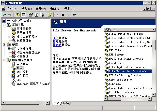 要设置AFP服务,只要右键我的电脑,,然后选择服务和应用程序下的“服务”。再双击AFP服务“File Server for Macintosh”会打开一个设置窗口,通过这个窗口可以停止和启动服务,也可以设置服务的启动类型,还可以设置登录参数和出现故障时的处理办法等。