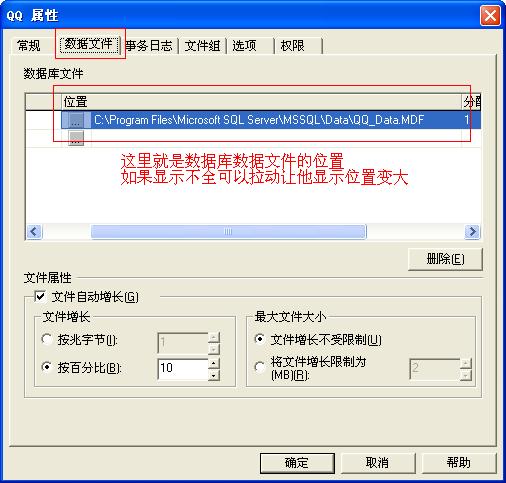 3.点击“数据文件”选项卡,记住数据文件的位置。然后点击“事务日志”,同样记住文件位置和文件名。