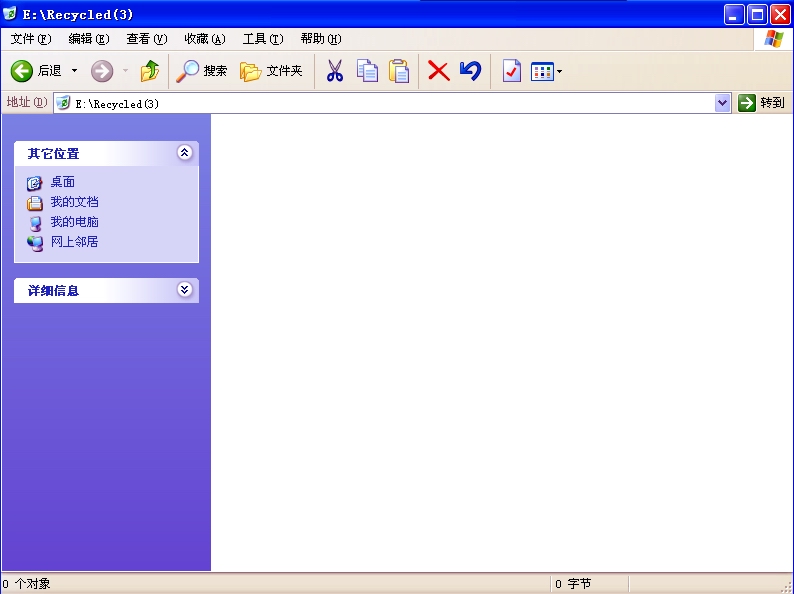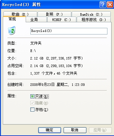 我发现我的E盘上有多个回收站,而且有一个占用较大的空间,打开它又没显示,但属性明明显示有,如下图。