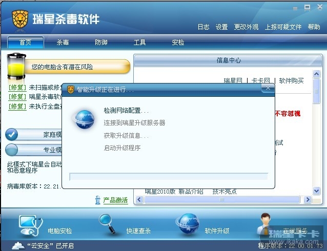 我的瑞星2010版的杀毒软件不能正常升级 注:2010版本是从官网上下载的 卡卡能正常升级 是怎么回事啊
