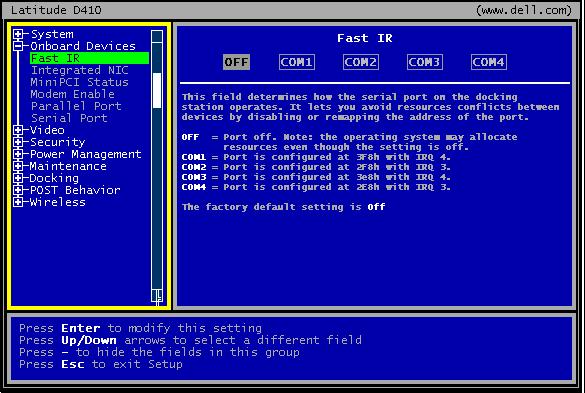 针对新机型D610、D810、D410等,按<F2>键进入系统设置程序(BIOS)后,在屏幕左侧树状结构里找到“ONBOARD DEVICE”(主板自带设备),敲回车键“ENTER”展开子目录。按下箭头键高亮度显示“Fast IR”(红外线数据端口),敲敲回车键“ENTER”进入右边的设置区,选择COM4端口(通常使用该端口),再次敲敲回车键“ENTER”。