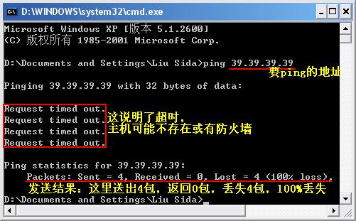 在默认的情况下windows的ping发送的数据包大小为32byt,我们也可以自己定义它的大小,但有一个大小的限制,就是最大只能发送65500byt,也许有人会问为什么要限制到65500byt,因为Windows系列的系统都有一个安全漏洞(也许还包括其他系统)就是当向对方一次发送的数据包大于或等于65532时,对方就很有可能挡机,所以微软公司为了解决这一安全漏洞于是限制了ping的数据包大小。虽然微软公司已经做了此限制,但这个参数配合其他参数以后危害依然非常强大,比如我们就可以通过配合-t参数来实现一个带有攻击性的命令:(以下介绍带有危险性,仅用于试验,请勿轻易施于别人机器上,否则后果自负)