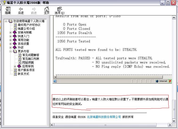 你测试了没有?没测试别说,别说这个了,连pcflank都通过不了,你试试看,你看它帮助呢,因为这个事我都反应给瑞星好多次了,记过四个版本都没改好,我失望了,现在改用费尔