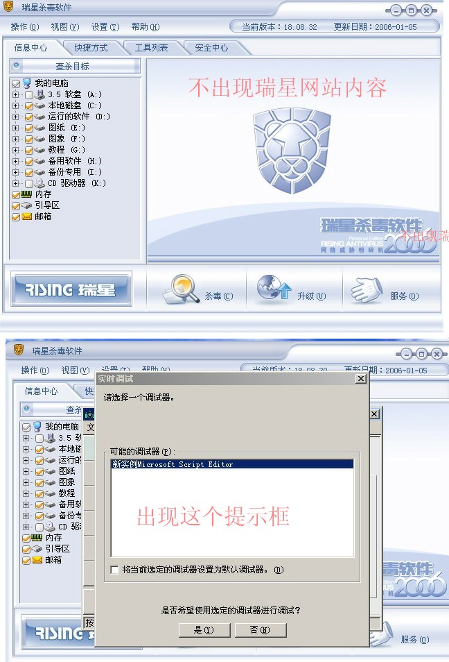 今日瑞星杀软升级后,双击打开启动画面,画面上不出现瑞星网站的内容,如图中上图所示.并且自动跑出来一个设置对话框如图中下图所示.不知如何设置.以前好好的今天才出现这个问题.敬请指导.[但是升级正常].
