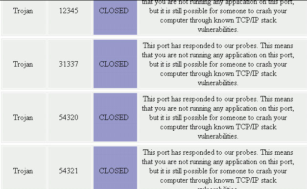 Trojan 12345 CLOSED This port has responded to our probes. This means that you are not running any application on this port, but it is still possible for someone to crash your computer through known TCP/IP stack vulnerabilities.