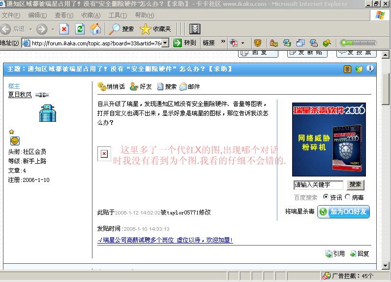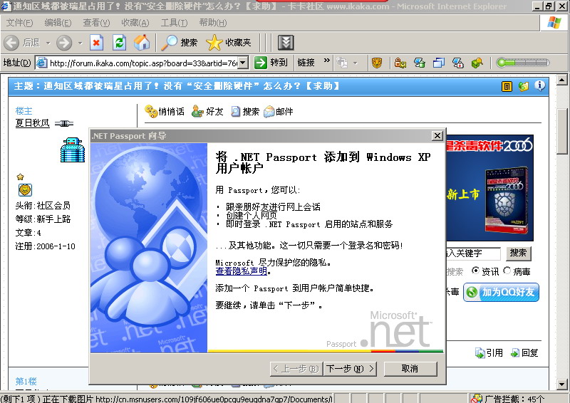 只要一打开这个贴子就自动下载一个东东,在下边的通知区能看到.停一会儿就出现这个对话框.[打开别的贴子不出现此问题.别的论坛也不出现此问题,试验了6次都是如此.]你们说怪不怪?