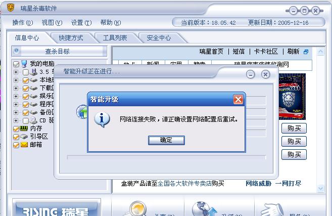 各位大虾!版本已升级,防火墙可以智能升级!但瑞星杀毒软件无法智能升级!出现"网络连接失败,请正确设置网络配置后重试!"对话框!请问:就如何设置才可以正常升级?谢谢!