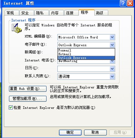 才想起以前安装过Foxmail,前不久被我卸载了,可能是它把自己设成了默认。于是打开OE的设置选项,却发现不能还原成默认设置,如图。我想把OE设为默认的,怎么办?