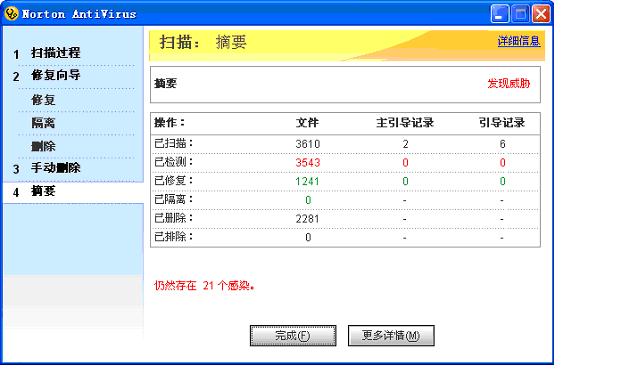 扫描完成后,发现病毒总数上与NIS2006一致,说明这都是些老病毒,NIS2005也能胜任。