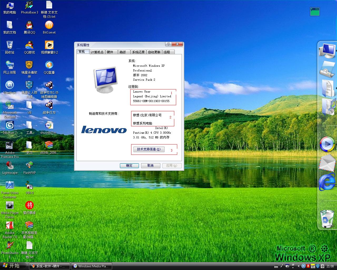 第二个就在你C:\windows\system32\下有一个OEMinfo.ini这个文件可以改,当然还有一个叫OEMlogo.bmp的就是你那个LENOVO标识,你可以用photoshop自己做一个替换。