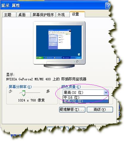 是在游戏过程中显示器闪烁几次颜色就变成32位色了,这个游戏玩了一年多没有问题,以前一直好好的,显示器也没有坏,显卡驱动更新后也不管用.在系统的显示属性中颜色只有16色和32色,以前的真彩色不见了.在适配器中"列出所有模式"选项下可以看到支持真彩色显示,应该是系统问题吧,请问下该怎么办.